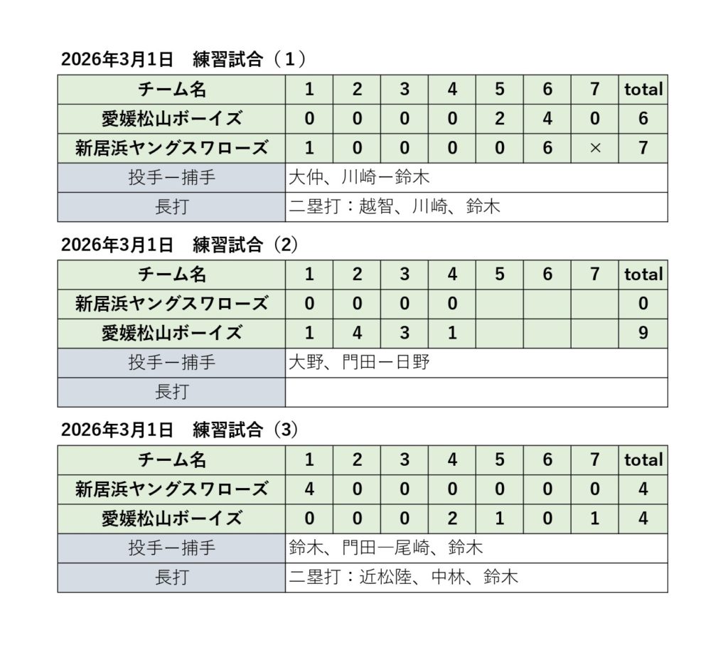 VS愛媛松山ボーイズ 2026年3月1日 最終更新日時 : 2026年3月3日 baseballswallows ツイート 愛媛松山ボーイズさんと練習試合を行いました。 天気が良く、暖かい中での練習試合だったので、両選手溌剌としたプレーが多く出ました。1試合目は、中盤までは、両投手の好投により、緊迫した試合でしたが、終盤、両チーム得点を重ね、7対6の1点差の好ゲームでした。 2試合目は、1年生以下で行われ、入団したばかりの6年生も出場し、中学生の距離感を体感できました。愛媛松山ボーイズさん、ありがとうございました。 Follow me! FacebooktwitterHatenaPocketCopy