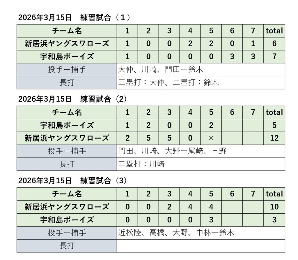 VS宇和島ボーイズ 2026年3月15日 最終更新日時 : 2026年3月15日 baseballswallows ツイート 宇和島ボーイズさんと練習試合を行いました。 先週に続き、今日もピッチャー陣は、積極的に攻めのピッチング、バッターは初球か振っていくことができ、個々に結果が出た試合でした。まだまだ課題もありますが、団員が一丸となって一戦必勝で全員野球で進んで行ってほしいです。 この時期に全国レベルの宇和島ボーイズさんと練習試合をできたことは、とてもいい経験ができました。宇和島ボーイズさん、ありがとうございました。 Follow me! FacebooktwitterHatenaPocketCopy
