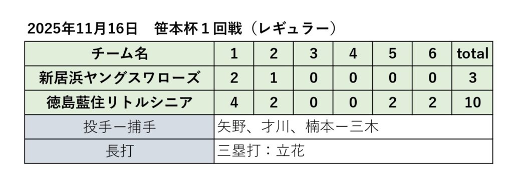 笹本杯1回戦 2025年11月16日 最終更新日時 : 2025年11月18日 baseballswallows ツイート 笹本杯1回戦が新居浜市営球場で行われました。対戦相手は、徳島藍住リトルシニアさんです。 好投手相手に、確実にヒットを打っていき得点に繋げていきましたが、初回の失点がひびき、初戦敗退となりました。 実力ある選手がそろった3年生の試合を見れるのもあと数試合です。寂しさも感じますが、しっかりと保護者一丸となって、最後まで応援していきます。ご声援ありがとうございました。 Follow me! FacebooktwitterHatenaPocketCopy