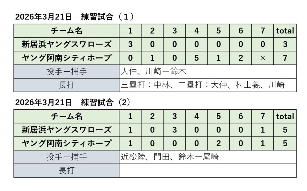 VSヤング阿南シティホープ 2026年3月21日 最終更新日時 : 2026年3月26日 baseballswallows ツイート ヤング阿南シティホープさんと連絡試合を行いました。 ヤング阿南シティホープさんは、来週開催されるヤングリーグ春季全国大会に四国代表として共に出場します。大会前に、全国出場するチームとの練習試合はとても貴重な試合でした。試合は、序盤いい流れで試合を運ぶことができましたが、終盤に逆転を許してしまいました。全国大会前に、いい課題が見つかり、実りのある試合ができました。 ヤング阿南シティホープさんありがとうございました。全国大会では、お互い一戦必勝で頑張りましょう。 Follow me! FacebooktwitterHatenaPocketCopy